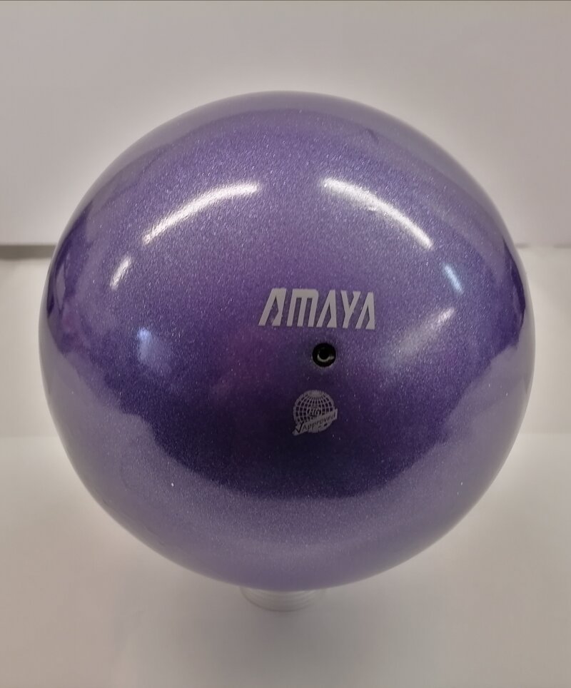 Palla AMAYA per ginnastica ritmica in plastica metallizzata di colore viola, certificata FIG per competizione, di diametro 180-200 mm e di peso 40-410 g.