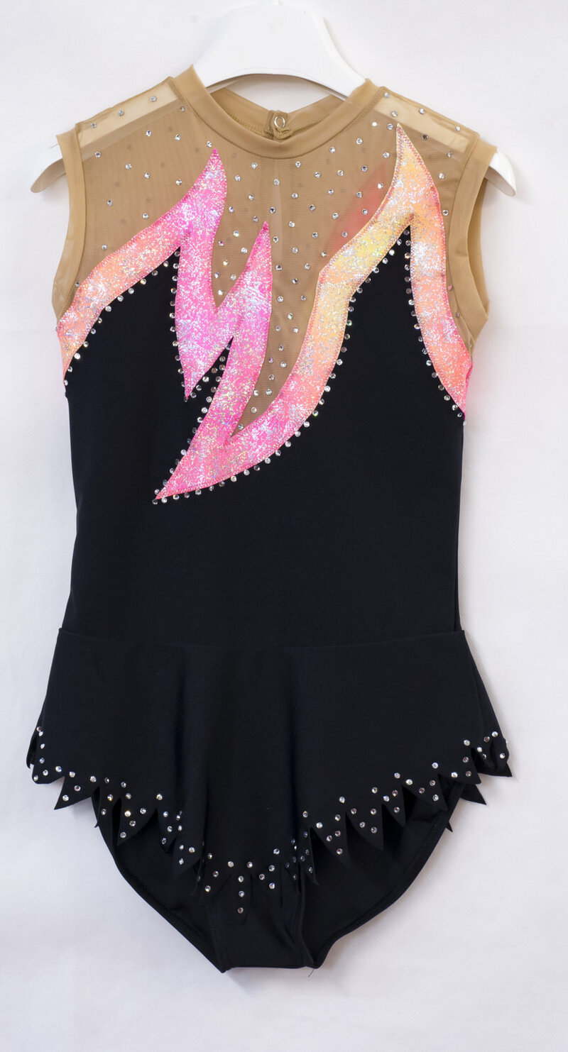 Body in lycra nera e rete carne con riporto disegno a punte, sfumato fucsia-giallo-arancio, rifinito con strass crystal.