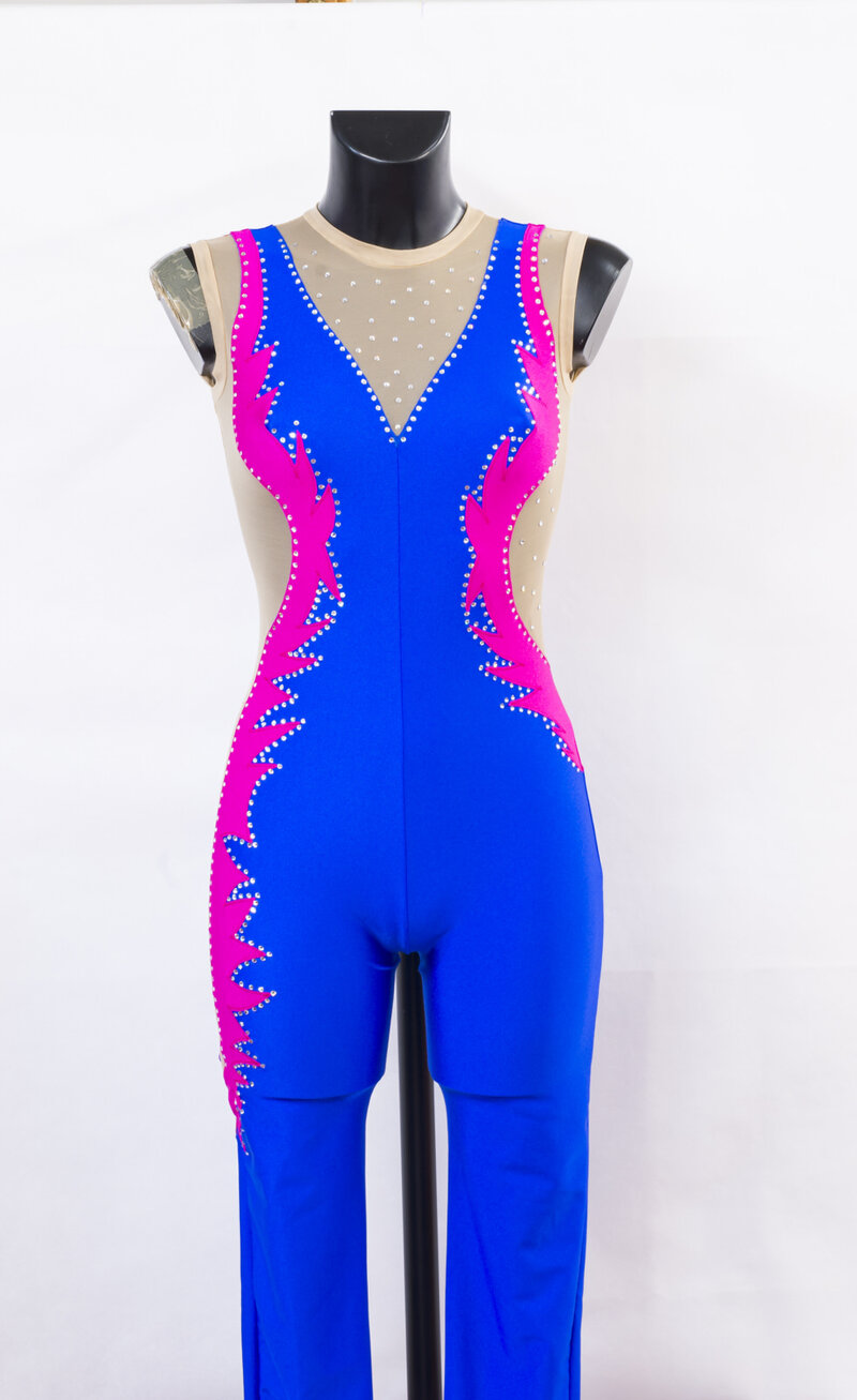 Body ritmica tuta intera in lycra blu e riporti in rete carne e in lycra fucsia.