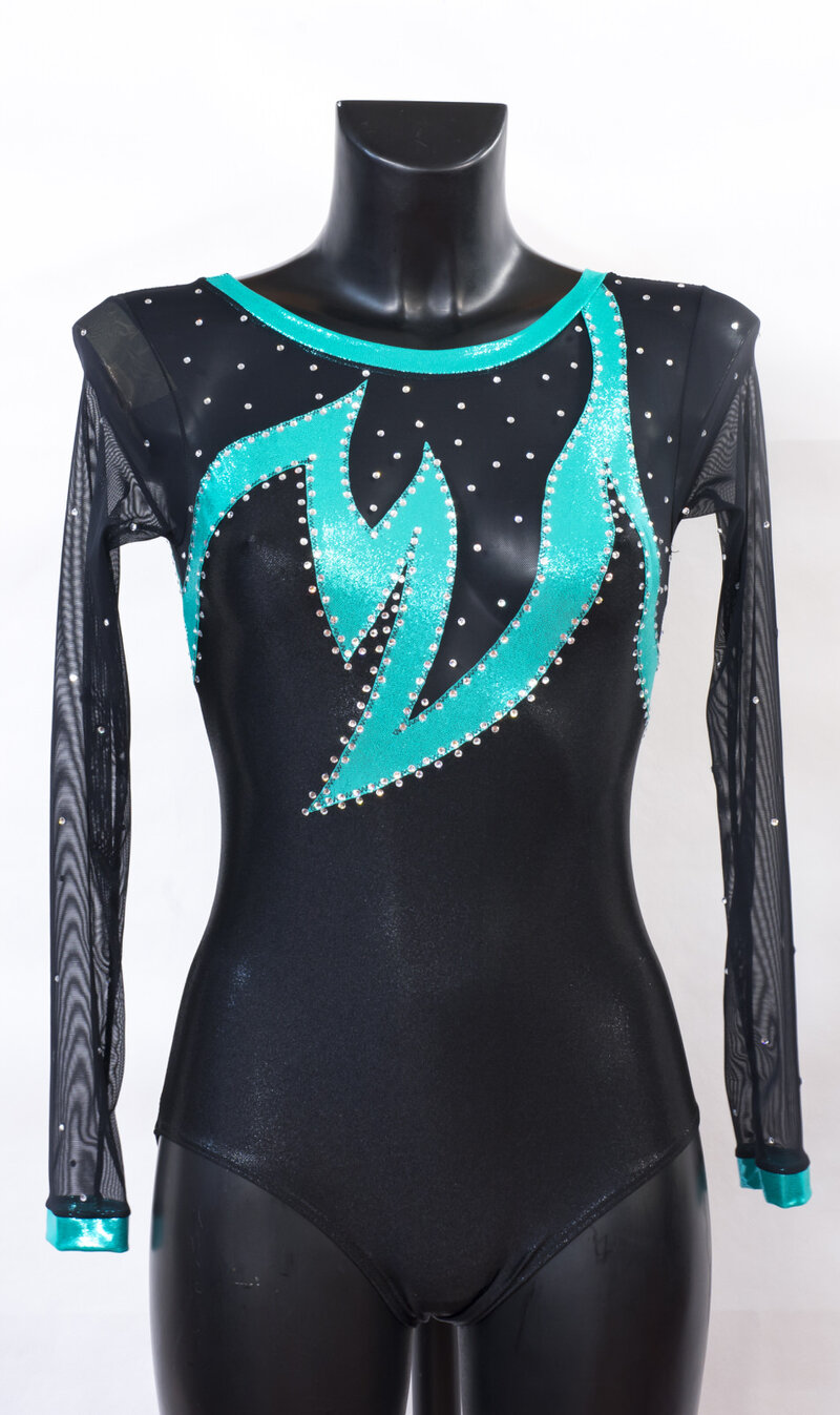 Body in lurex Nero con riporti in lurex Verde acqua e rete nera, maniche in rete nera, rifinito con strass crystal.
