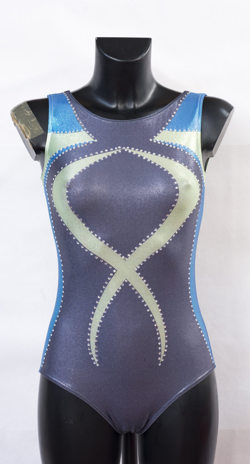 Body in lurex stampato nero con disegni di colore verde e azzurro, rifinito con strass crystal.