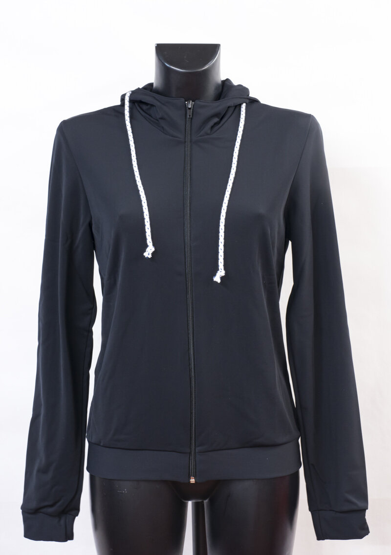 Tuta in vuelta nero con cappuccio con cerniera, polsini alle maniche e fascia in fondo tutto vuelta nero.